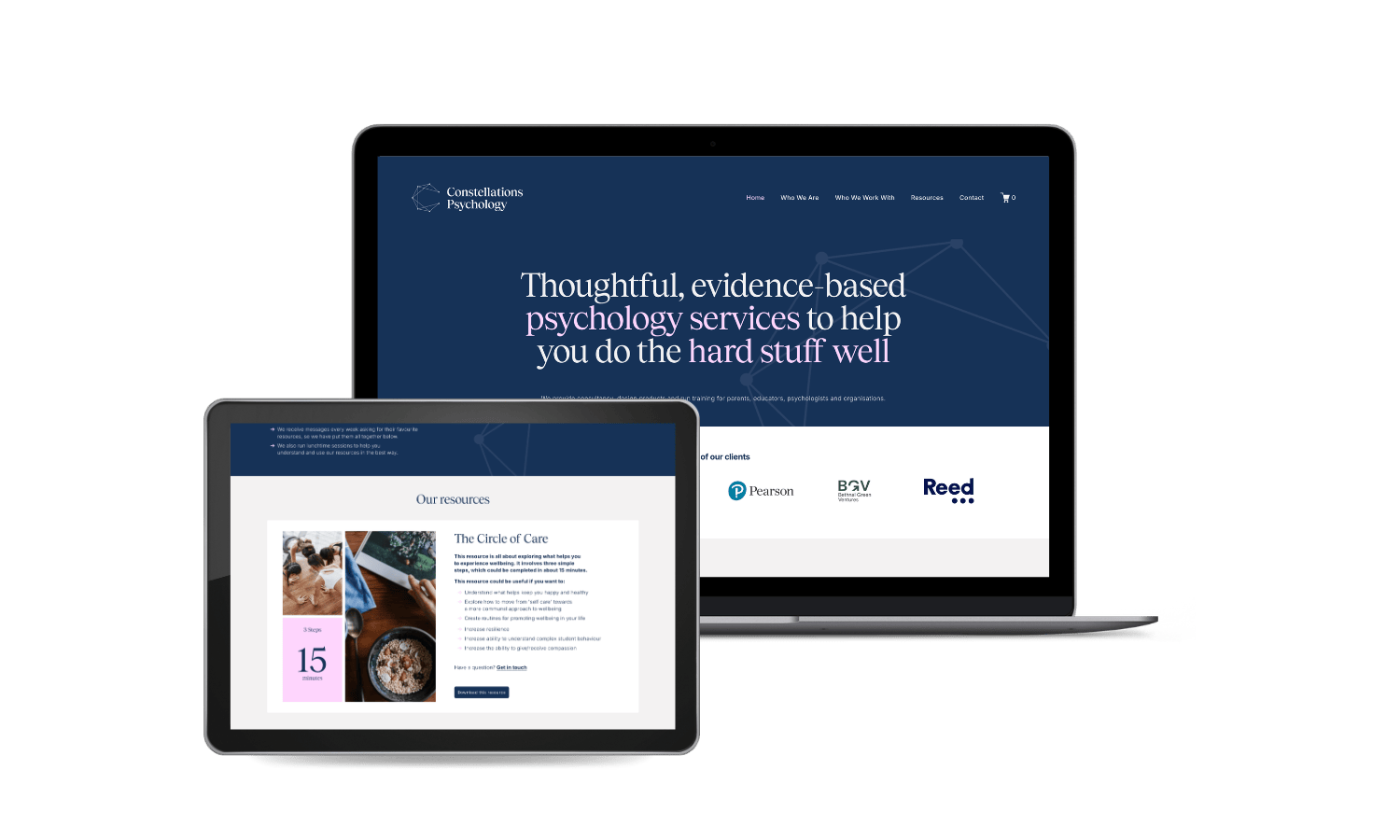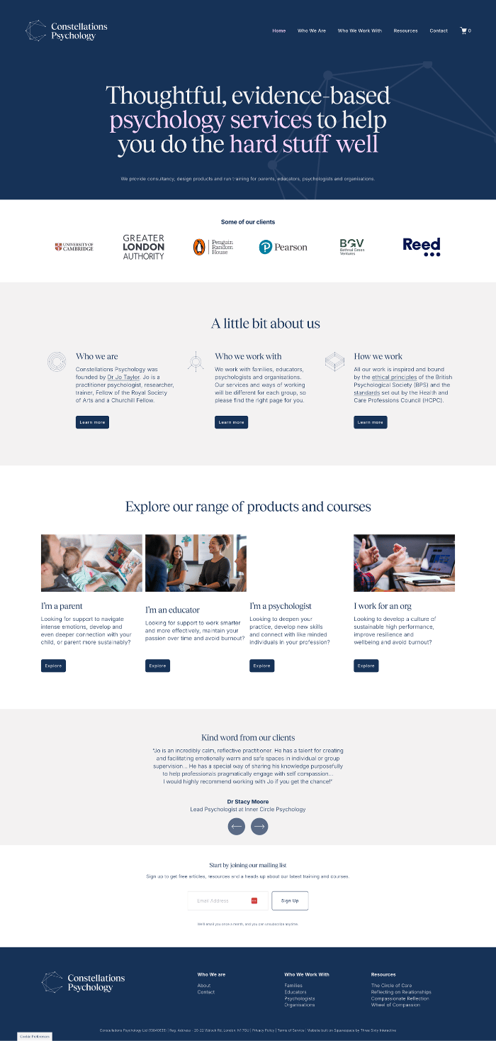 Dr Jo Taylor, the founder and director of Constellations Psychology wanted his website to speak meaningfully to four very different audiences - parents, educators, fellow psychologists, and organisations - without the homepage feeling like a confusing mix of messages. The solution was a clean audience-routing structure that lets visitors self-select early, with dedicated pages for each group that can speak directly to their specific pain points and needs. The overall aesthetic is calm and considered — deep navy tones, measured typography, and restrained use of illustration, signalling professionalism and approachability. This website handles structural complexity without ever making the visitor feel it.
